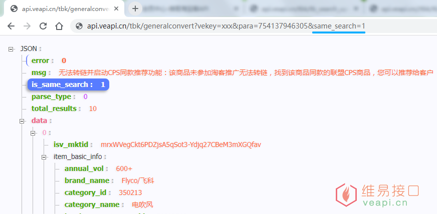 http://api.veapi.cn/tbk/generalconvert?vekey=xxx¶=20739895092&same_search=1