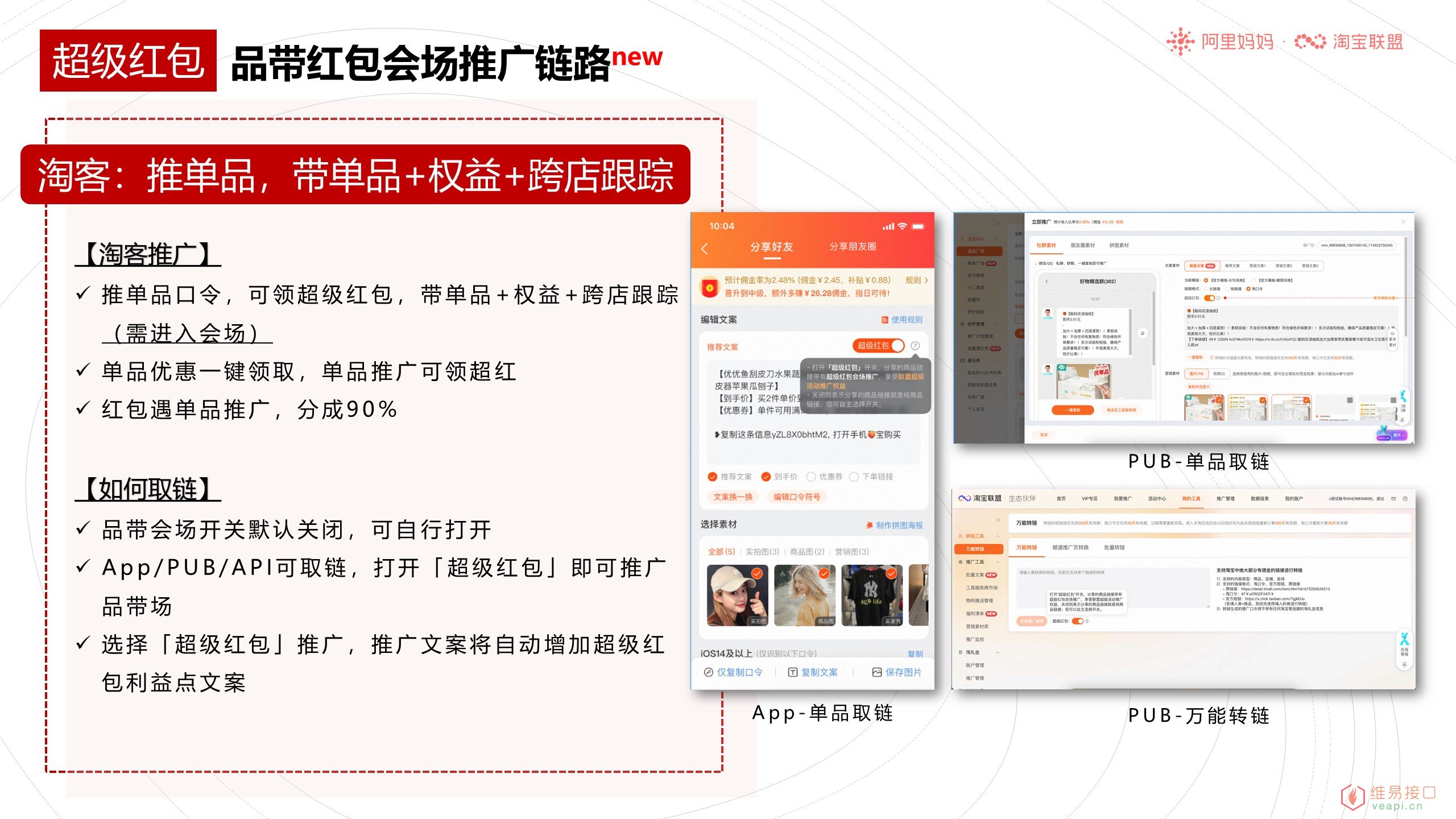 品带红包会场推广链路是双11超级红包推广期的新产品能力。该链路支持淘客推单品同时推广超级红包会场,消费者可一键领取单品优惠(超级红包+礼金+券),淘客可获得更高推广收益(单品+权益+跨店跟踪)。