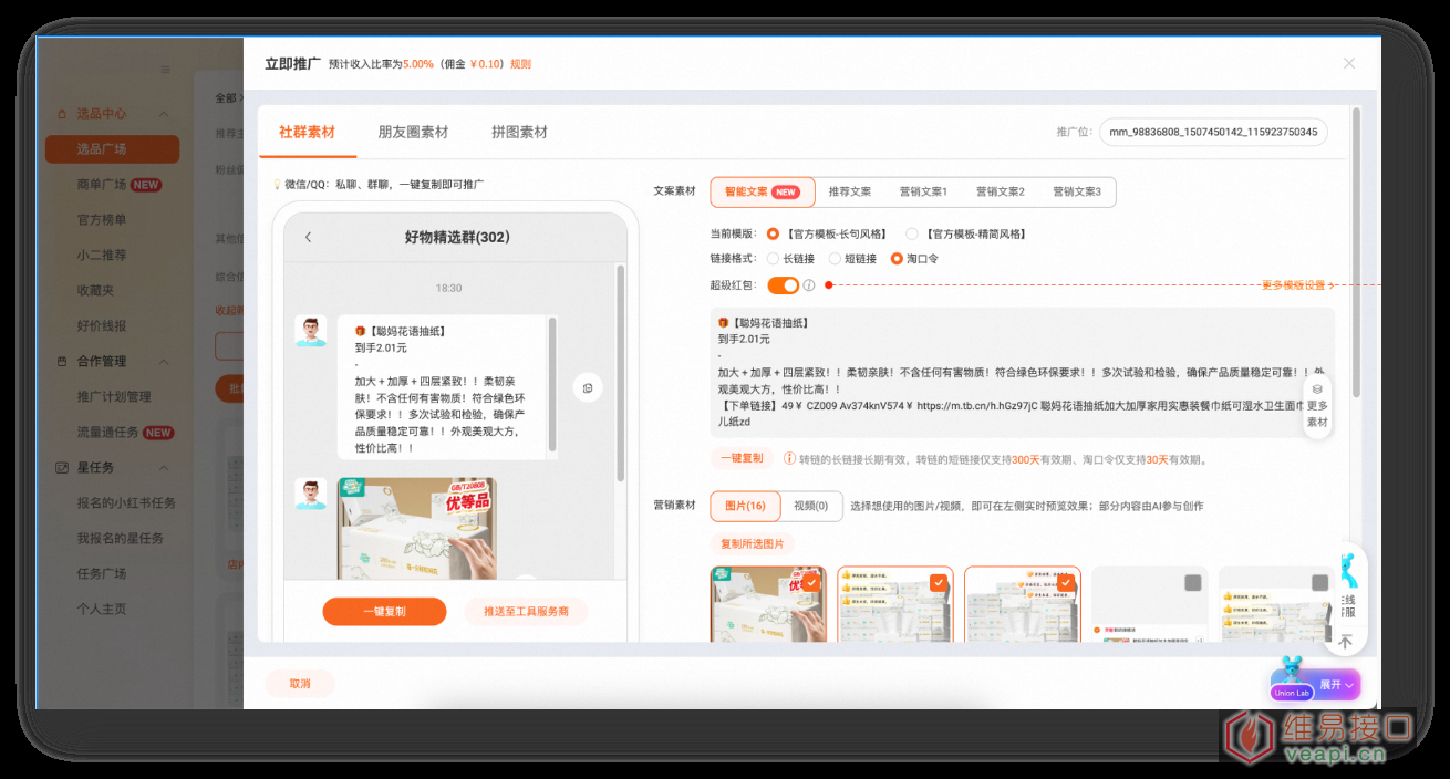 ● 「品带红包会场」推广链路可自选开关,淘客可自由选择推广方式