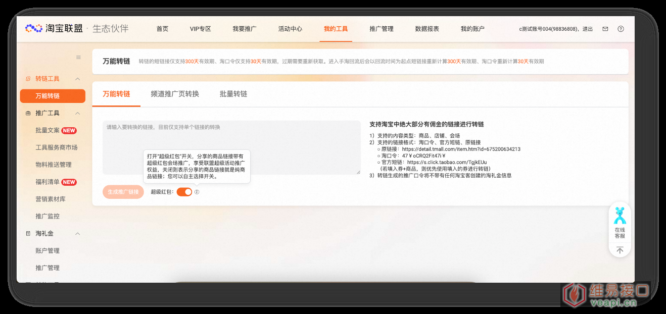 ● 单品推广界面/万能转链界面均有品带红包会场推广的按钮:「超级红包」,默认关闭,打开即可推广品带红包会场;